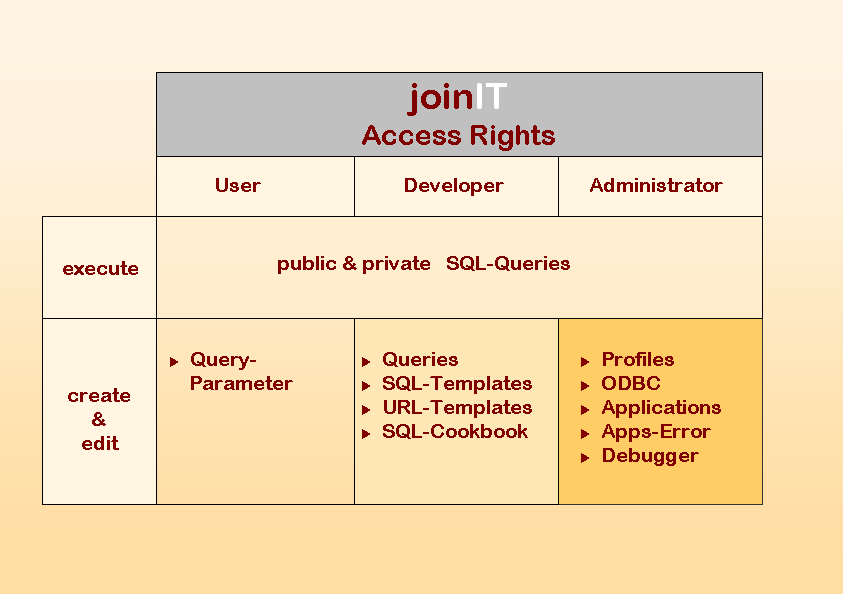 Über die Portalfunktion können Reports gebündelt werden. Zusätzlich kann eine beliebige Kombination an Zugriffsrechten definiert werden z.B. Benutzer Müller und Meier sowie alle Mitarbeiter der Gruppe Sales u. Marketing und alle Mitarbeiter aus der eigenständigen Vertriebsfirma können Reports aufrufen. Portale werden über den Browser konfiguriert und sind sofort verfügbar. Zusätzlich besteht die Möglichkeit, die Dokumentation von Portal-Queries in das integrierte joinIT-Hilfesystem einzubinden.